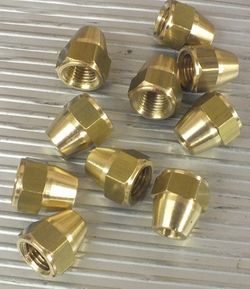 Pack of 10 brass female unions for 1/4" diameter pipe. Thread 7/16" x 20tpi UNF, 19/32"(15mm) AF spanner size, overall length 0.71"(18mm)