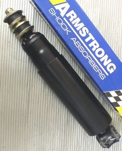 Description: Plain boxed rear shock absorber(Armstrong are no longer available) with eye mounting at top and spigot at bottom. Supplied with bushes for top, and bushes, washers and nut for bottom.